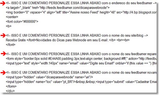 No final do código há algumas opções que devem ser alteradas de acordo com o endereço do FeedBurner e os links das imagens publicadas anteriormente.